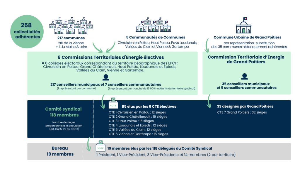 A ce jour, le territoire du Syndicat ENERGIES VIENNE compte 258 collectivités adhérentes (communes et EPCI). Afin de garantir une organisation du service public de l’énergie efficace, pérenne et centrée sur les besoins des communes et de leurs habitants, les élus sont au cœur de toutes les instances.